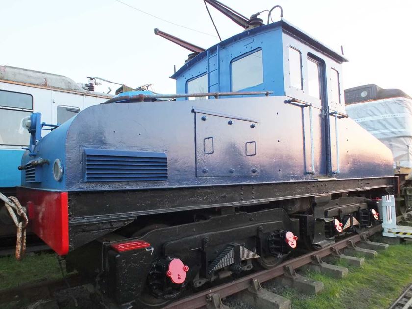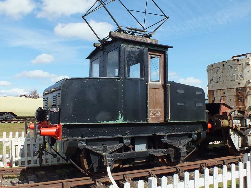 This loco weighs in at 20 tons and can be supplied by traction power from either an overhead wire or by the on board batteries that are mounted in banks inside each bonnet. The loco has a 35hp DC motor mounted on each axle which has a very low gearing enabling the loco to pull loads way beyond what its size would suggest but with the trade off that top speed is a mere 9mph! This example was built for the Derbyshire & Nottinghamshire Electric Power Company and was used throughout its working life at Spondon power station in Derbyshire where it was the first of a fleet of three such locos utilised there for hauling loads of coal from the exchange sidings with the main line to feed the power stations boilers. It moved to Baginton in 1999 and has subsequently been restored to a fully operational condition.