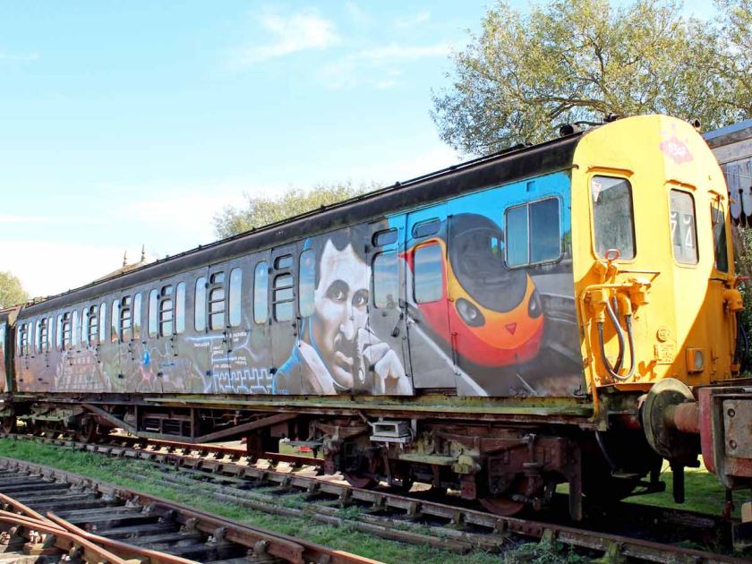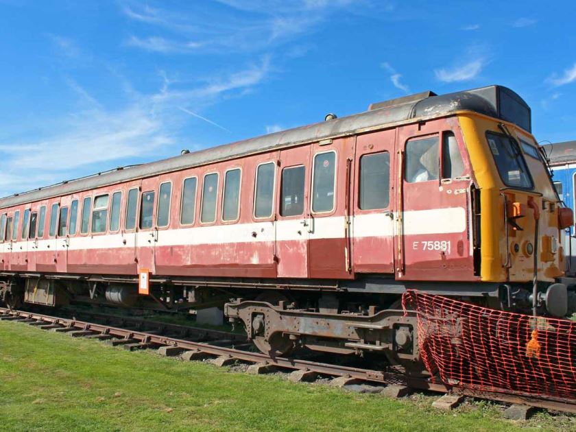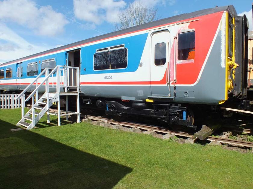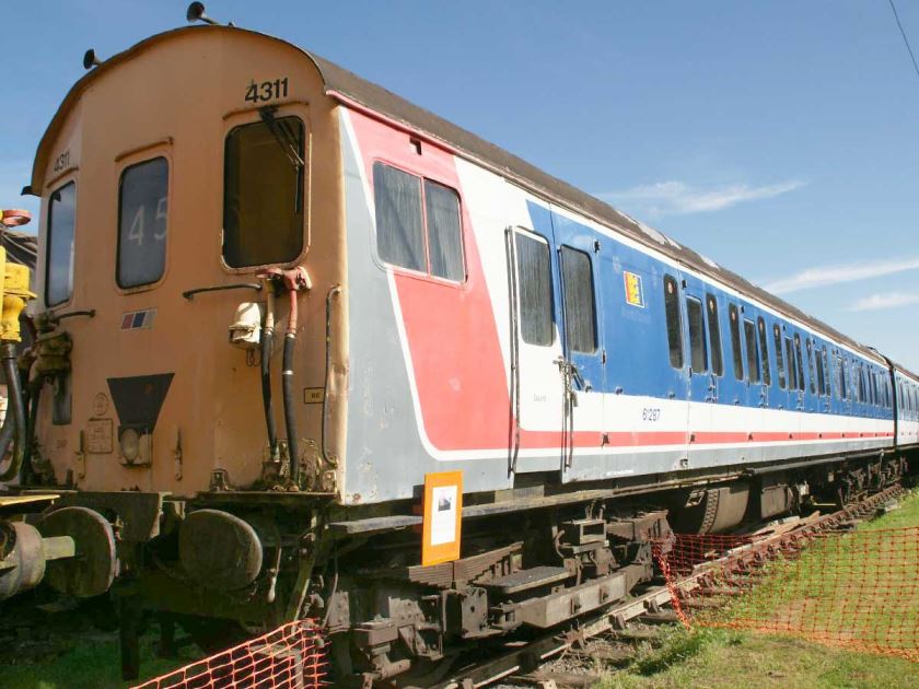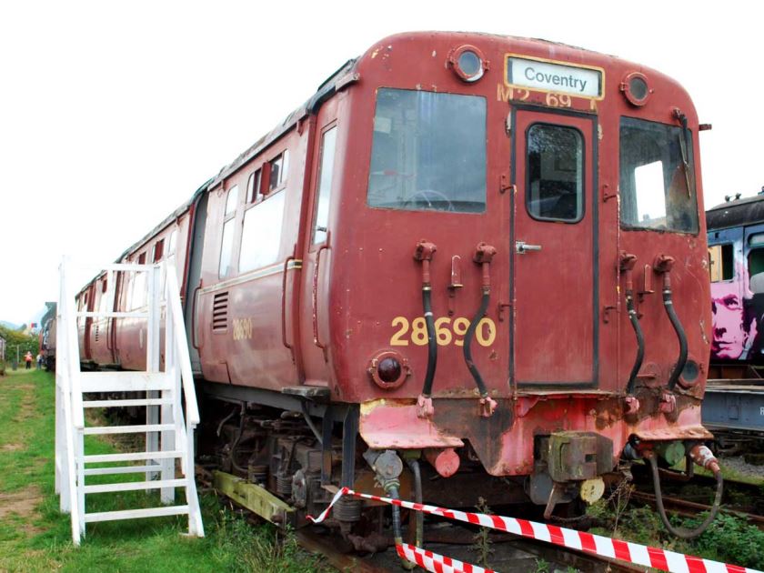 Two coaches of what was once a four car unit as an example of the British Railways Mark 2 EMU stock that ran on semi fast and suburban services in Essex and The Midlands. The units were built to take power from 25,000v AC overhead wires and offered both first and second class accommodation with a maximum speed of 90mph. This particular unit was originally built for Great Eastern line services from London Liverpool Street, but ended up its days working out of London Fenchurch Street Station on the London Tilbury and Southend line services. The unit was withdrawn from service in 2003, having been replaced by new Class 357/2 “Electrostar” units. After being placed into store for a number of years they entered preservation 2008 and has been subject to some considerable restoration work since it arrived at Baginton. These are a unique item in that they are the last examples of the Class 312s to survive.