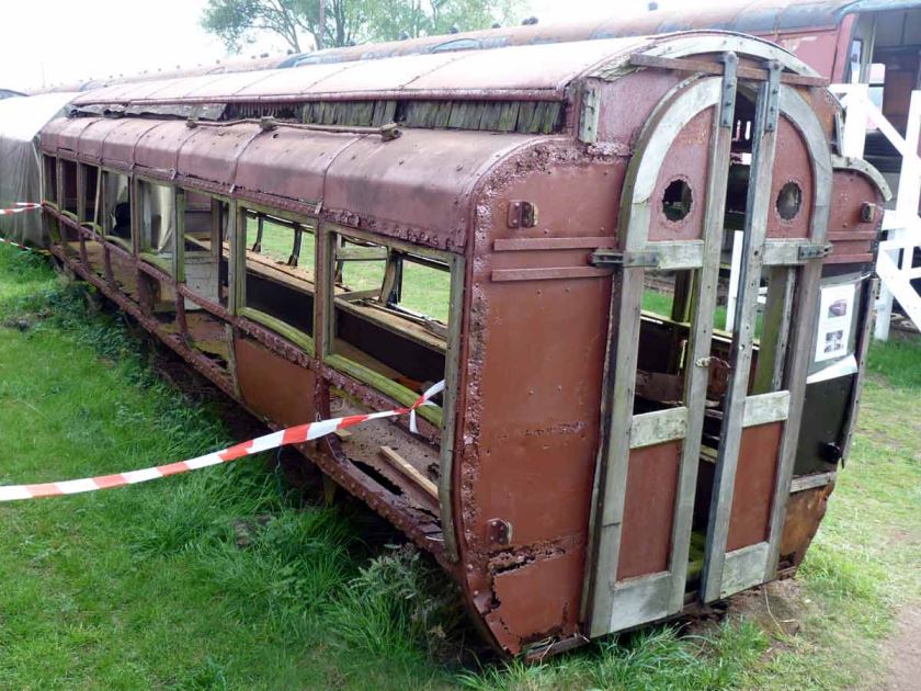 Two bodies of carriages built for the City and South London Railway (C&SLR) are present at Baginton. The oldest is a timber body on a steel underframe and dates from 1903 the other is from 1907 and unlike earlier builds, was all steel construction. This makes it the oldest surviving steel frame carriage in the UK. The C&SLR was the first deep-level underground “tube” railway in London, and the first major railway to use electric power for traction. The sets of 3 carriages were pulled by an electric locomotive along the tunnels. The line still exists as is known today as the City Branch of London Underground’s Northern Line. After use on the C&SLR both bodies were sold for re-use as a summer house in a garden in Hertfordshire. Having arrived at Coventry in such a poor state in 2000 it was decided that the best plan for the steel car body is one of conservation, with the metal work being treated to prevent any further decay, and painting so that as much of the original remains. This work is on-going at the time of writing. The timber bodied car has seen no work since arrival and has been stored under heavy tarpaulin. These are unique items and the last example of these types of C&SLR Trailer Cars to survive.